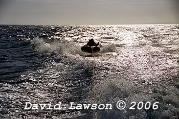 The Australian skipper of the 2005 Sydney-Hobart V60 ABN AMRO salutes the arrival of ABN AMRO 2 with an official fly past on a inflated tractor tyre tube.
