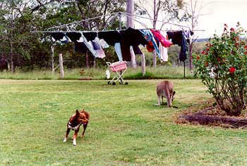 dogs, cloths out on the line, roses and the odd Kangaroo at Boompa,