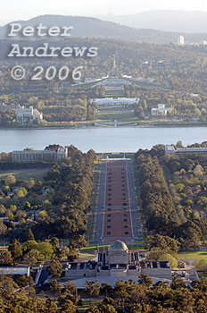 The Australian National War Memorial, Anzac Parade, the old and the new Parliament Houses' in Canberra.