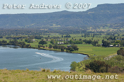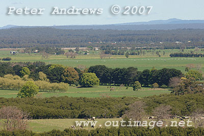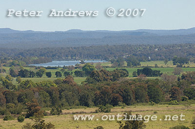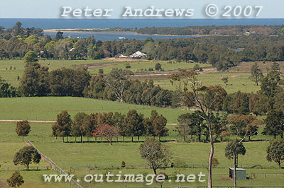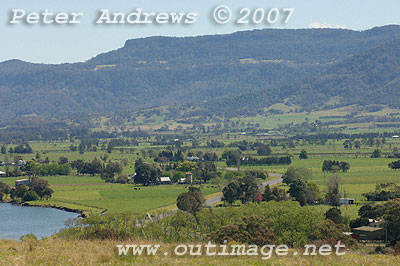 Looking south accross the Shoalhaven River floodplain. The small bump in the distant mountain range (under the letter "A" in the copyright notice) is the top of Pigeon House Mountain, west of Milton and Ulladulla.
