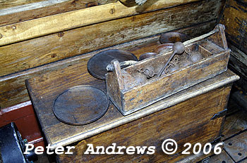 The ship's bilge pumps operate by the 2 leavers just in front of the binnacle box and steering position in the aft end of the main cabin.