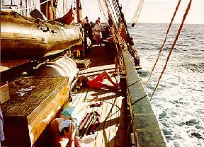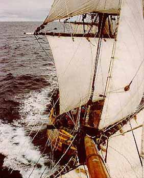 "The 'Bounty' at sea is an incredible experience. However at the time, she unfortunately had been allowed to get into quite a run down state. During the voyage quite an alarming number of things broke down... and motoring through the tropics as the master was alleged to have some fear of the wind, was of no further help to the situation". |
