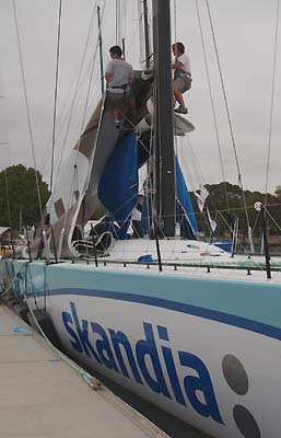 keel. Skandia's crew are seen dealing with the boat's huge mainsail,