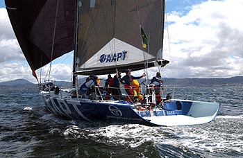 Sean Langman's AAPT charges up the Derwent to be second over the line in the 2004 Rolex Sydney to Hobart Yacht Race.