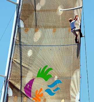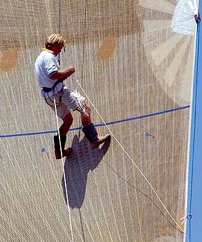 of the crew of Brindabella making some last minute sail repairs