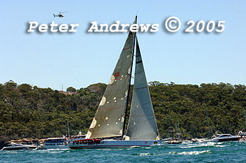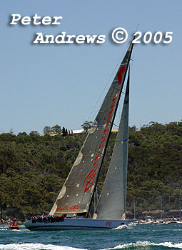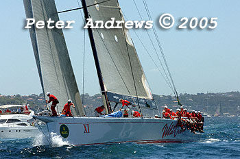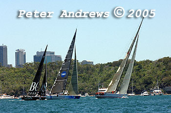 Bob Oatley's Wild Oats ahead of Stuart Thwaites' super maxi Konica Minolta and Alex Thompson's Hugo Boss with crew wearing black suits after the start of the 2005 Rolex Sydney Hobart Yacht Race.