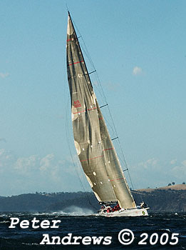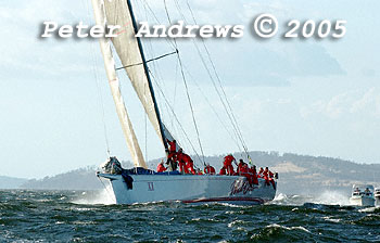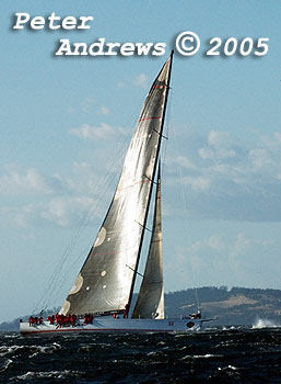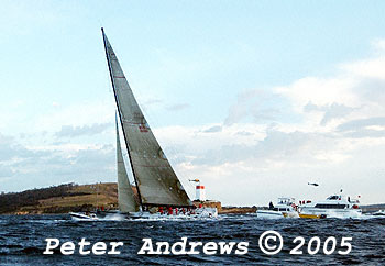 Wild Oats IX passes the Iron Pot Lighthouse which marks the entrance of the the Derwent River.