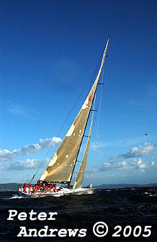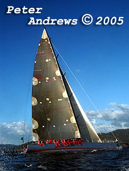 The crew of Wild Oats XI seen trying to get the mainsail down quickly to prevent it from being torn to bits from the fresh 15 knot north-westerly.