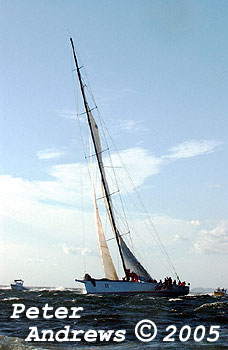 With only nautical five miles to the finishing line, the top batten of the mainsail blows out to cause havoc.