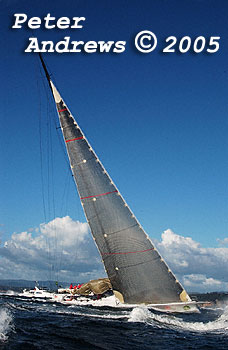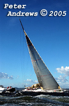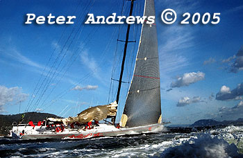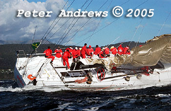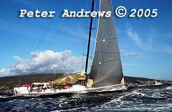 Wild Oats XI working up the Derwent River with just a headsail after experiencing problems with their main.