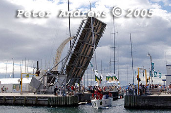Toecutter passes under the Constitution Dock draw bridge.