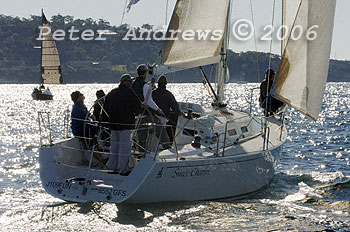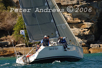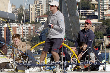 A cropped close-up of the the crew on Alan and Tom Quick's Sydney 38, "Outlaw" .