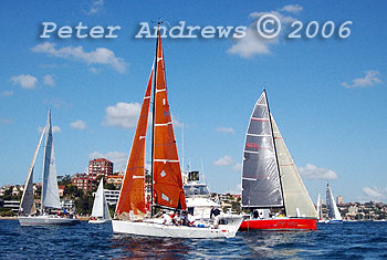 Stuart Bancroft's "London Calling" crosses the starting line with Ray Stone's "Razors Edge"; Roger Hickman's "Wild Rose"; Jon Short and Miles Bastick's "MRX"; and Robert Skol's "Scarlett O'Hara".