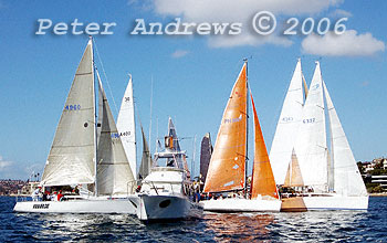 Stuart Bancroft's "London Calling" commencing a penalty turn around the start boat; in front of the Pacific Sailing School's "Cadenza"; Paul Clitheroe's "Balance"; and Roger Hickman's "Wild Rose".
