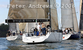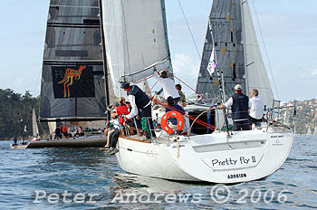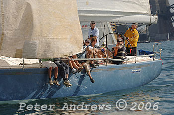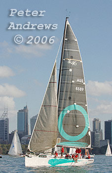 A bunch of boats drifting around the top mark that include: Michael Cranitch and Ray Wallace's "Broomstick"; Robin Crawford's "Assassin"; Geoff Morgan and Andrew Banks' "Your Hired";Denis O'Neil's "Atomic" and Stephen Girdis' "Free Spirit".