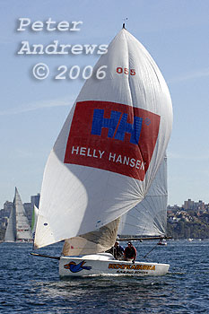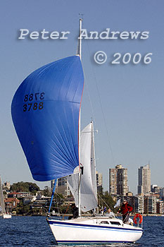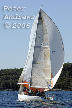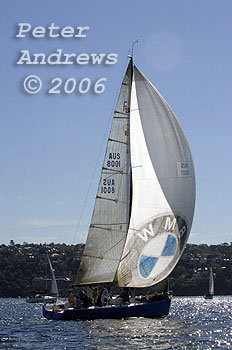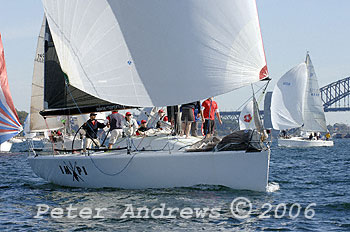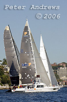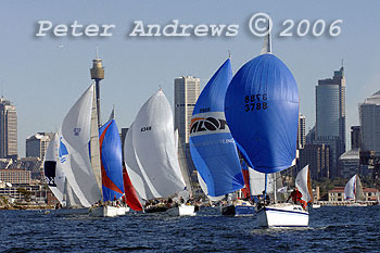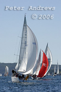From left to right: Chris Bowling's "Lunch on Sunday" under spinnaker way out in front of Ray Stone's "Razors Edge" in the forground; Trevor Jarrett's "Alpha Carinae" (behind "Razors Edge's" spinnaker) is also ahead of Bruce and Neil Tavener's "Obsession II"; Carr, Cook and Burke's "Mortage Choice Rumba" behind "Obsession II's" spinnaker; and Bill Mirow's "Privateer" behind an unidentified boat on the far right.