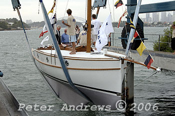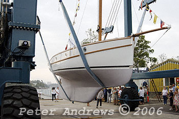 Sean Langman's 9.1 metre gaff-rigged Ranger, Maluka, being prepared for launch at Sydney's Woolwich Dock.