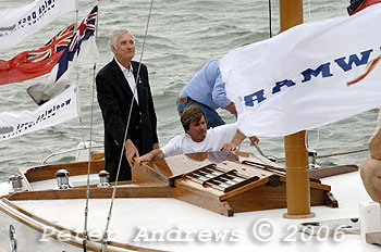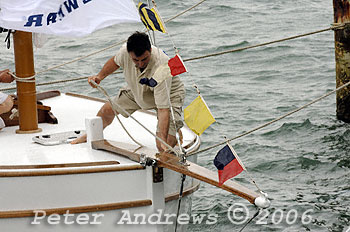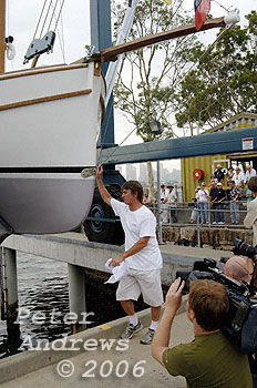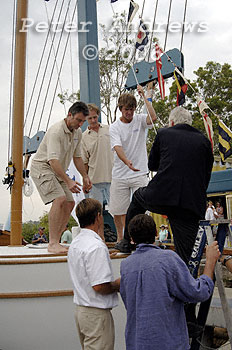 Sean provides a hand to Bill Gale to board Maluka for its launch at Sydney's Woolwich Dock.