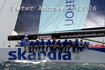 Out on the rail as they enter the Tasman Sea on Grant Warrington's "Skandia", after the start of the 2006 Rolex Sydney to Hobart Yacht Race.