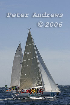 Graham Jackson's Davidson 34 "Illusion" and Michael Dolphin's modified Mount Gay 30 "Prion", outside the heads after the start of the 2006 Rolex Sydney to Hobart Yacht Race.
